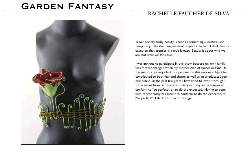 Art and design reveal complexity while highlighting what is most important. The artists participating in this exhibit accepted an invitation to make sculptures in the form of breast prostheses. Some of the artists are women who have experienced breast cancer, but many are not. No matter who they were, the artists used the very thing that conceals the effects of breast cancer to reveal things that can guide our collective response to this complex disease.